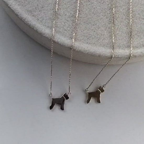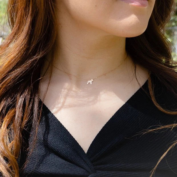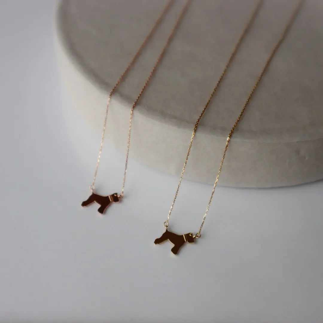 ミニチュアシュナウザーの特徴である健康的なスクエアなシルエットにこだわり、断耳をしていない垂れ耳、首元にはさり気なく首輪も着用しているCookie Pooch オリジナルネックレスです。