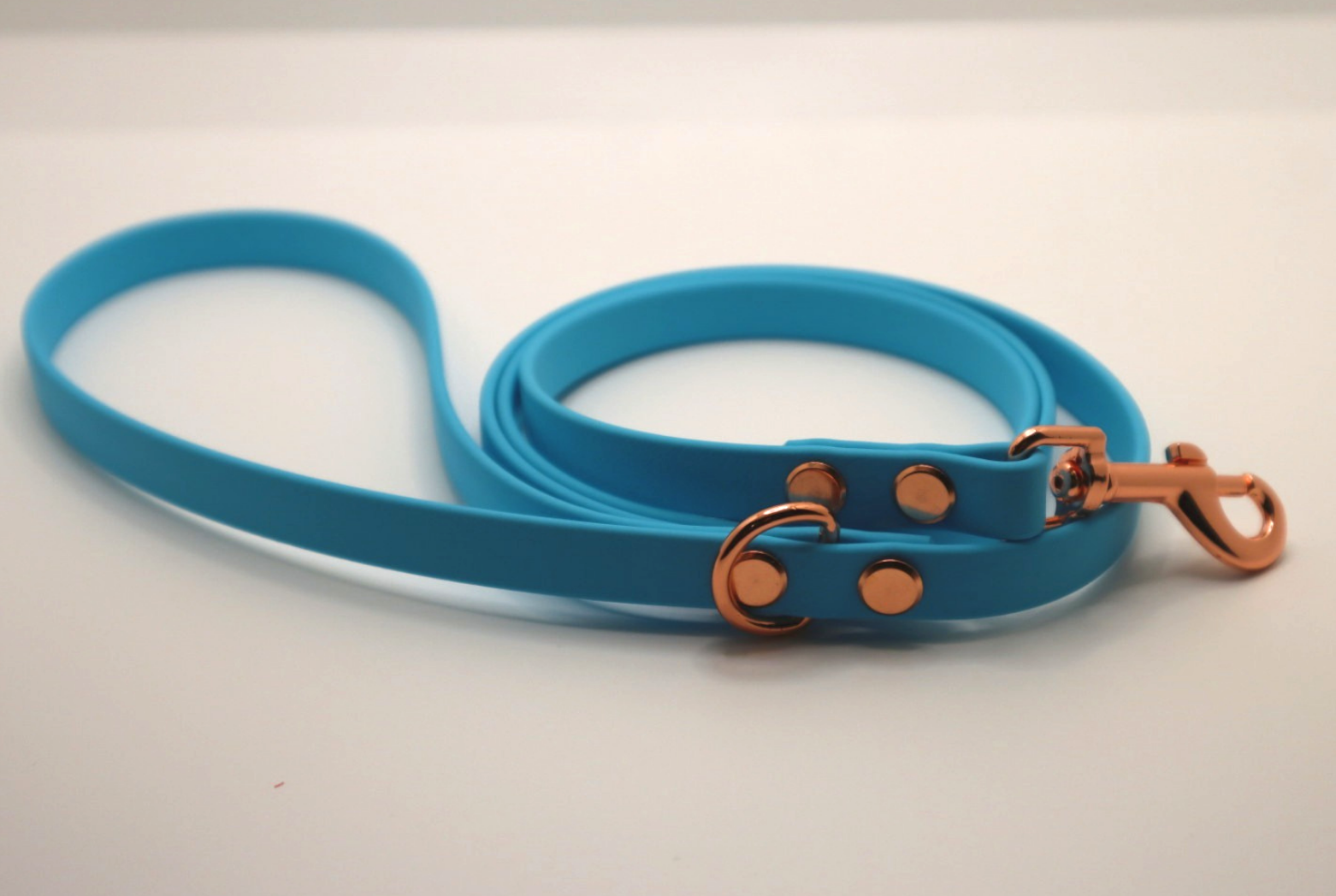 Light Blue BioThane dog lead. BioThane is extremely durable, waterproof, stinkproof and therefore headache proof for dog owners. This lead is great for adventurous pups that like to get muddy or go swimming.