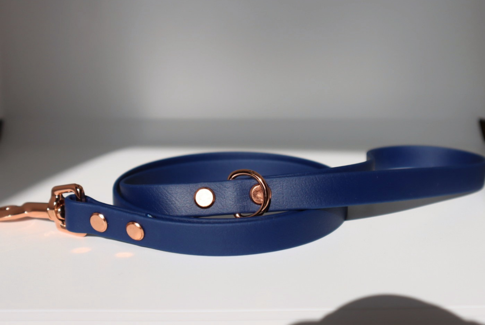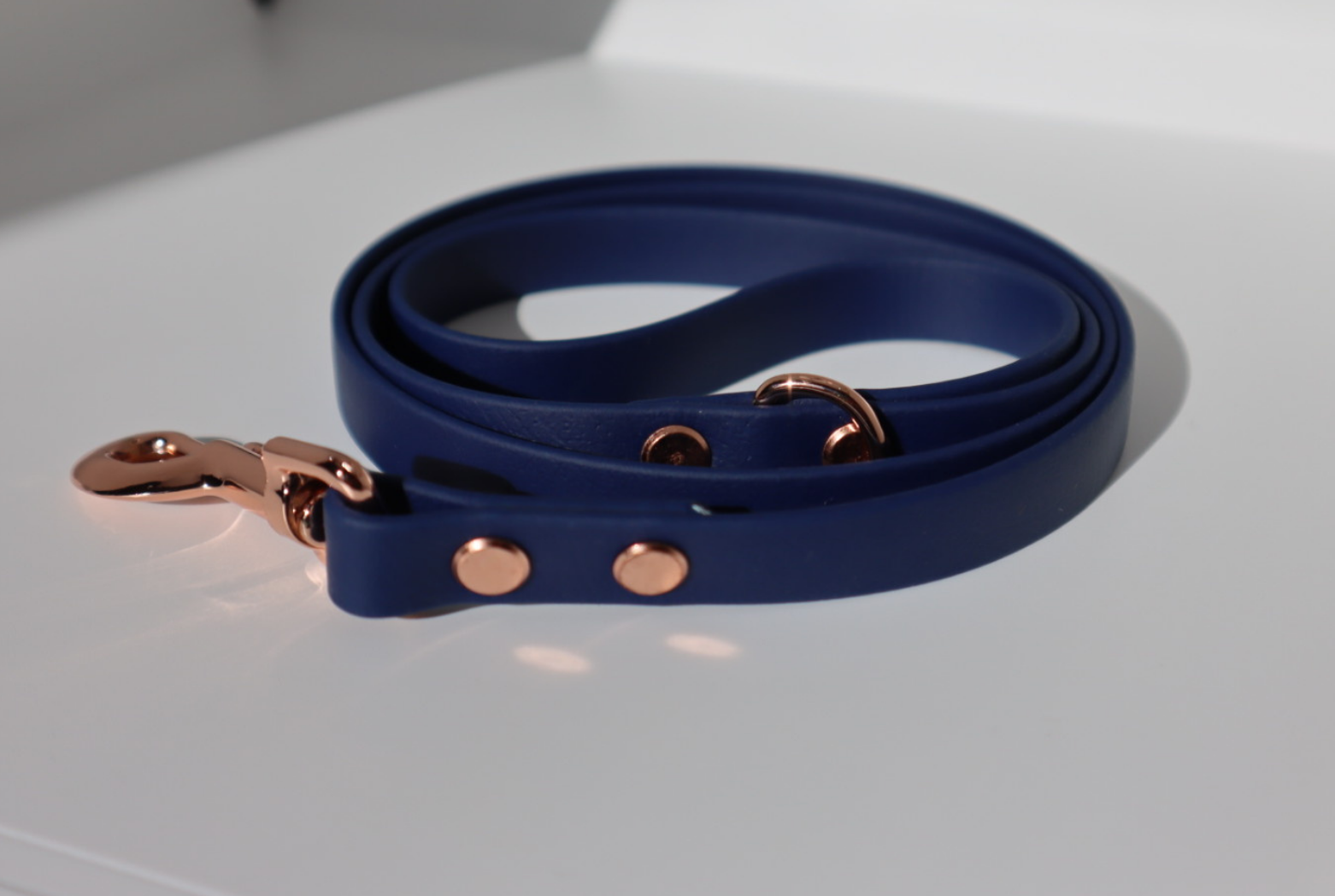 Navy BioThane dog lead. BioThane is extremely durable, waterproof, stinkproof and therefore headache proof for dog owners. This lead is great for adventurous pups that like to get muddy or go swimming.