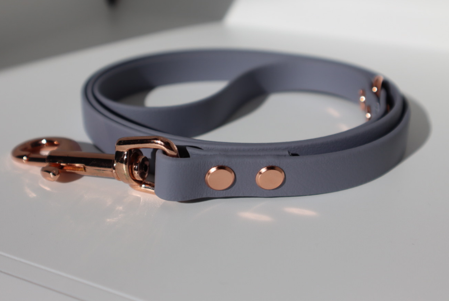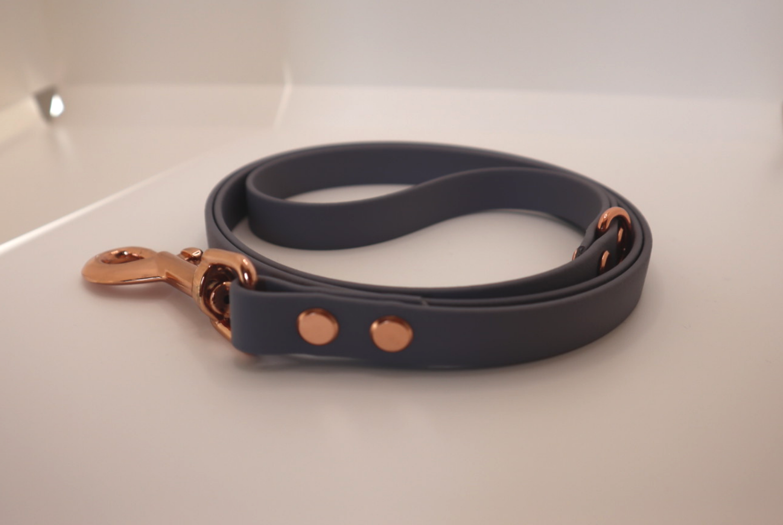 Gray BioThane dog lead. BioThane is extremely durable, waterproof, stinkproof and therefore headache proof for dog owners. This lead is great for adventurous pups that like to get muddy or go swimming.