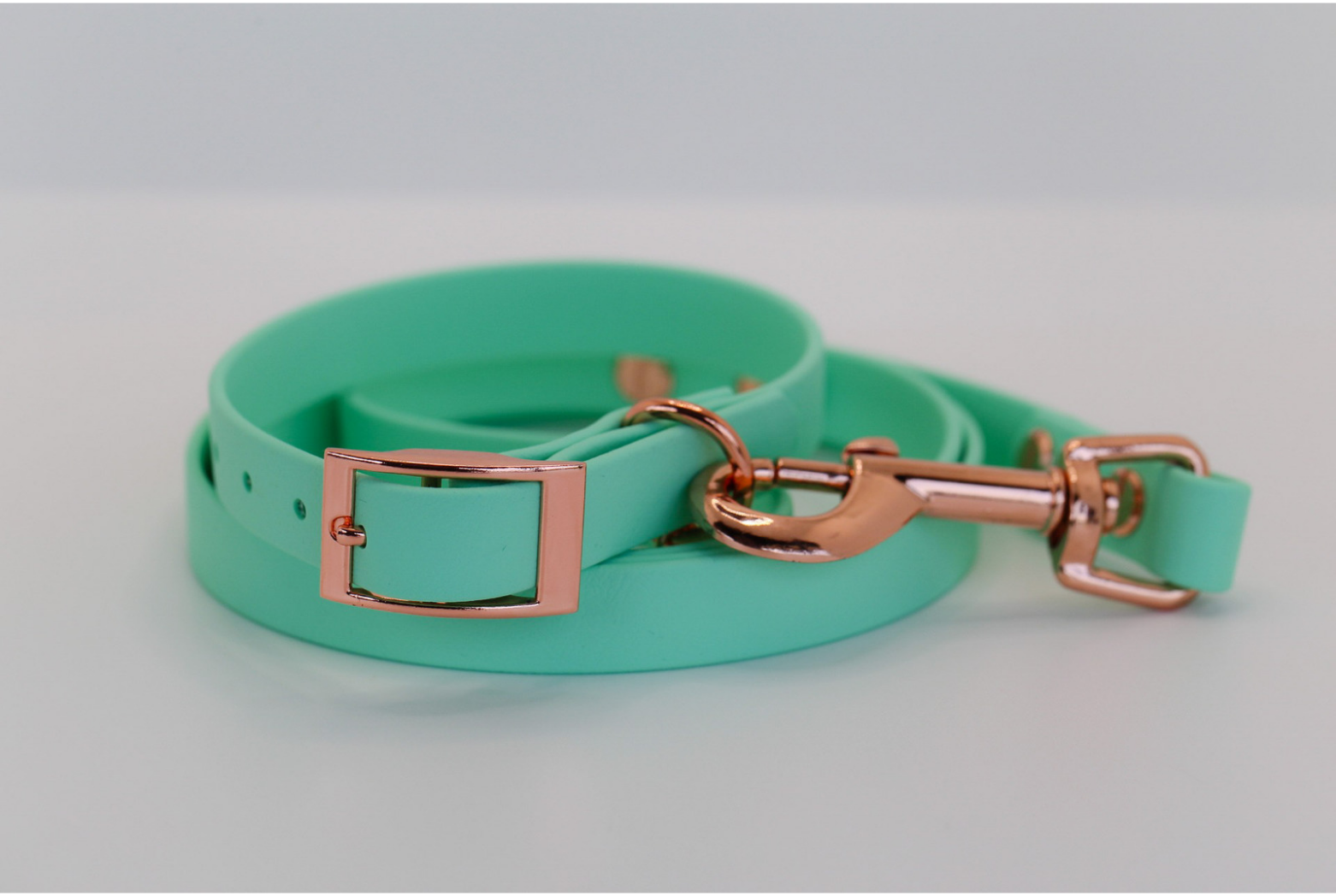 Lgiht Green BioThane dog lead. BioThane is extremely durable, waterproof, stinkproof and therefore headache proof for dog owners. This lead is great for adventurous pups that like to get muddy or go swimming.