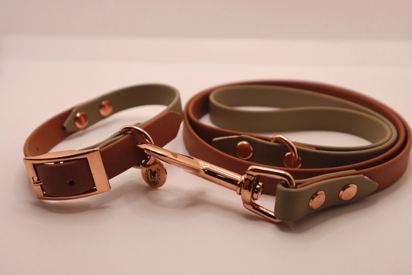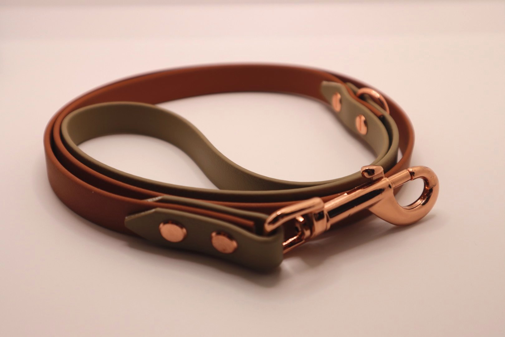 Brown×Olive BioThane dog lead. BioThane is extremely durable, waterproof, stinkproof and therefore headache proof for dog owners. This lead is great for adventurous pups that like to get muddy or go swimming.