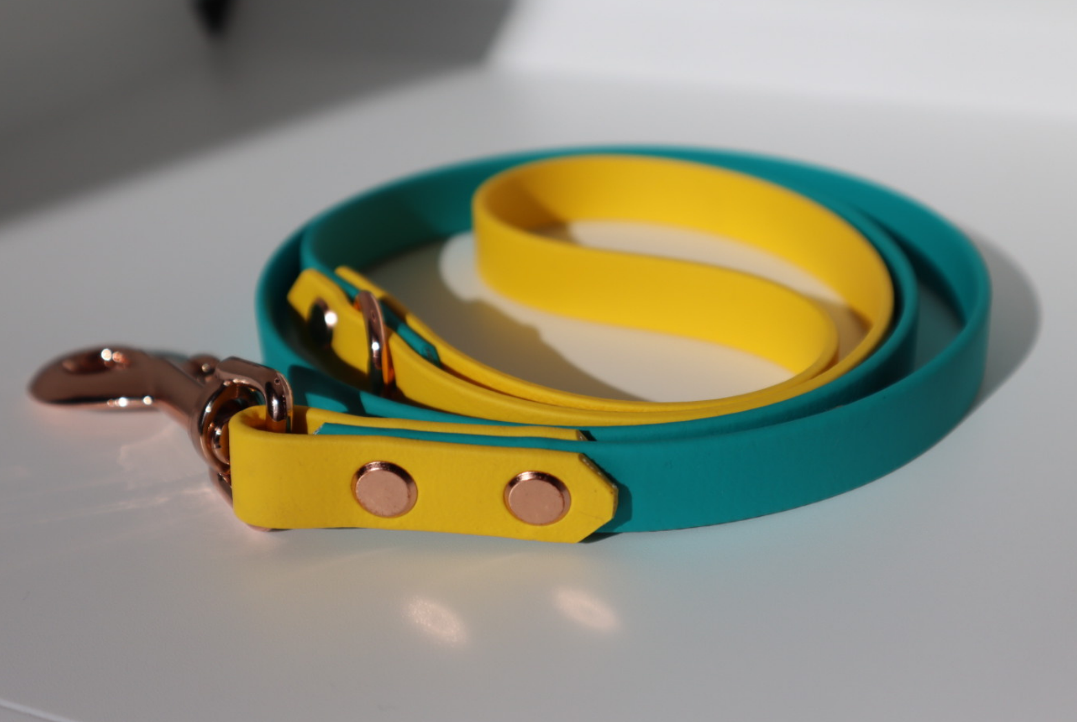 Teal×Yellow BioThane dog lead. BioThane is extremely durable, waterproof, stinkproof and therefore headache proof for dog owners. This lead is great for adventurous pups that like to get muddy or go swimming.