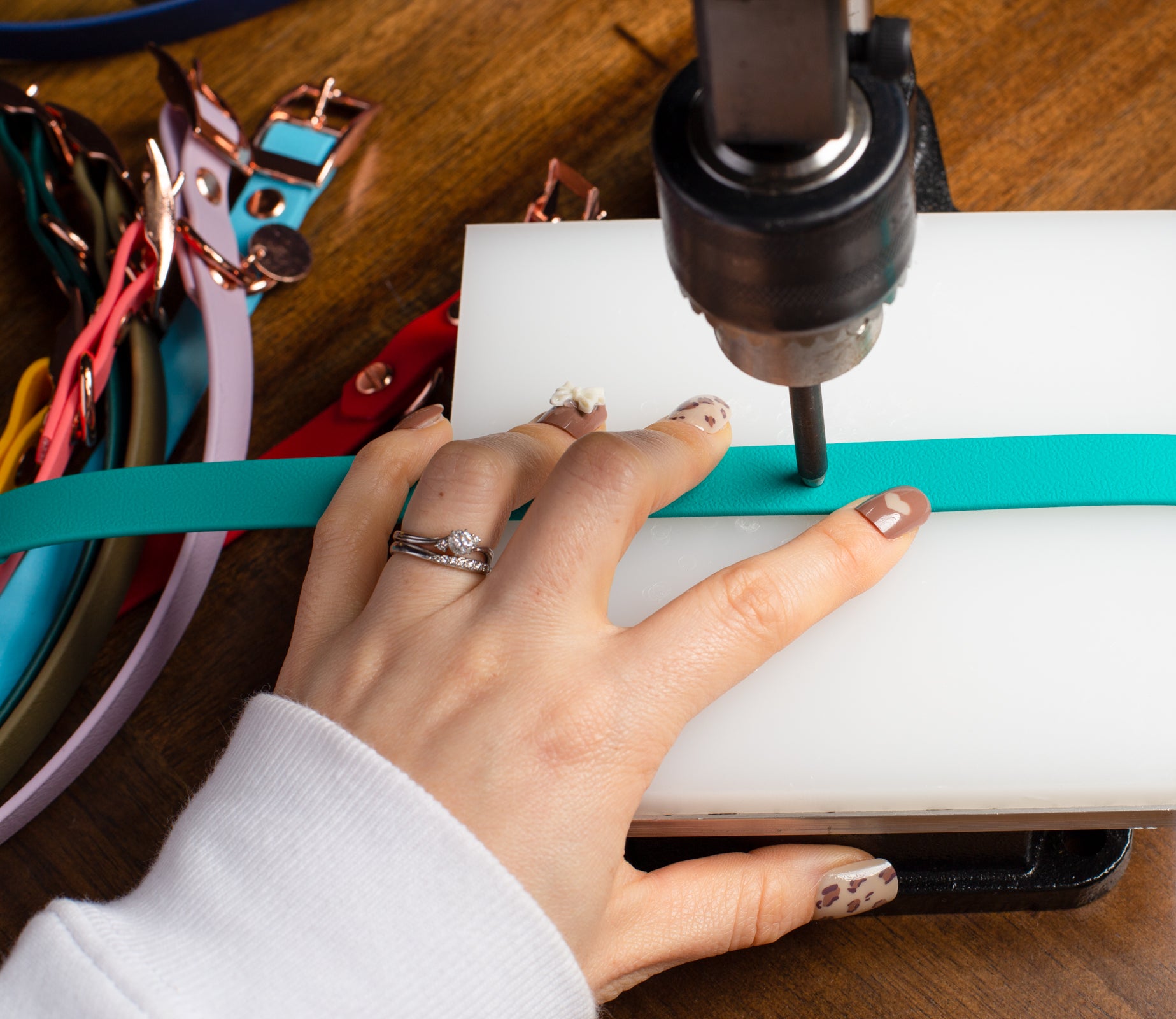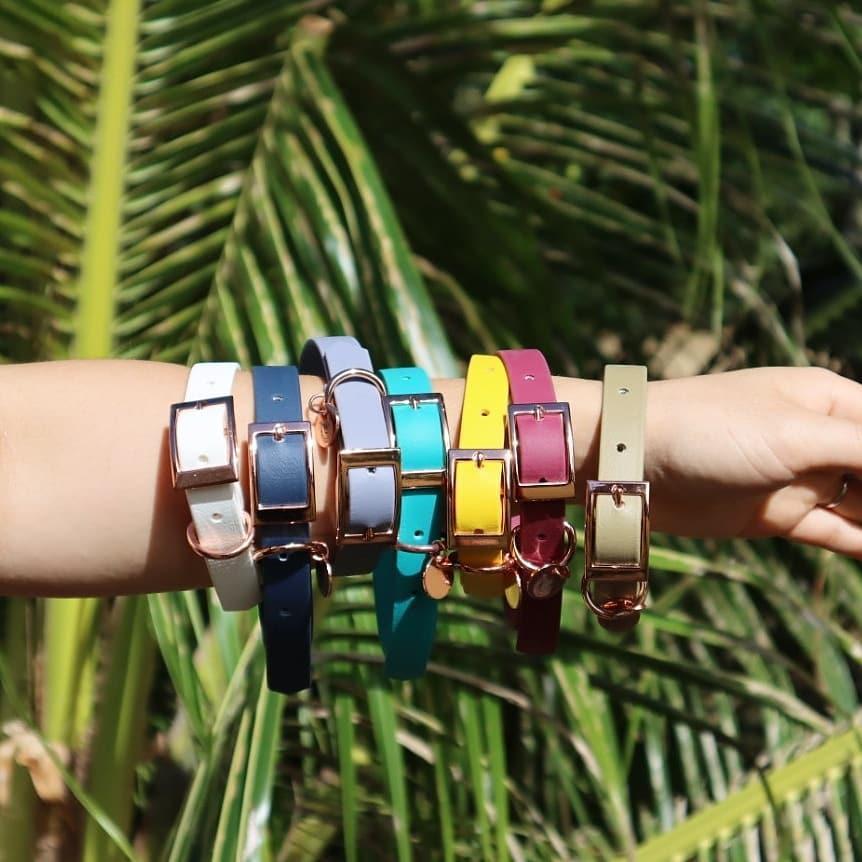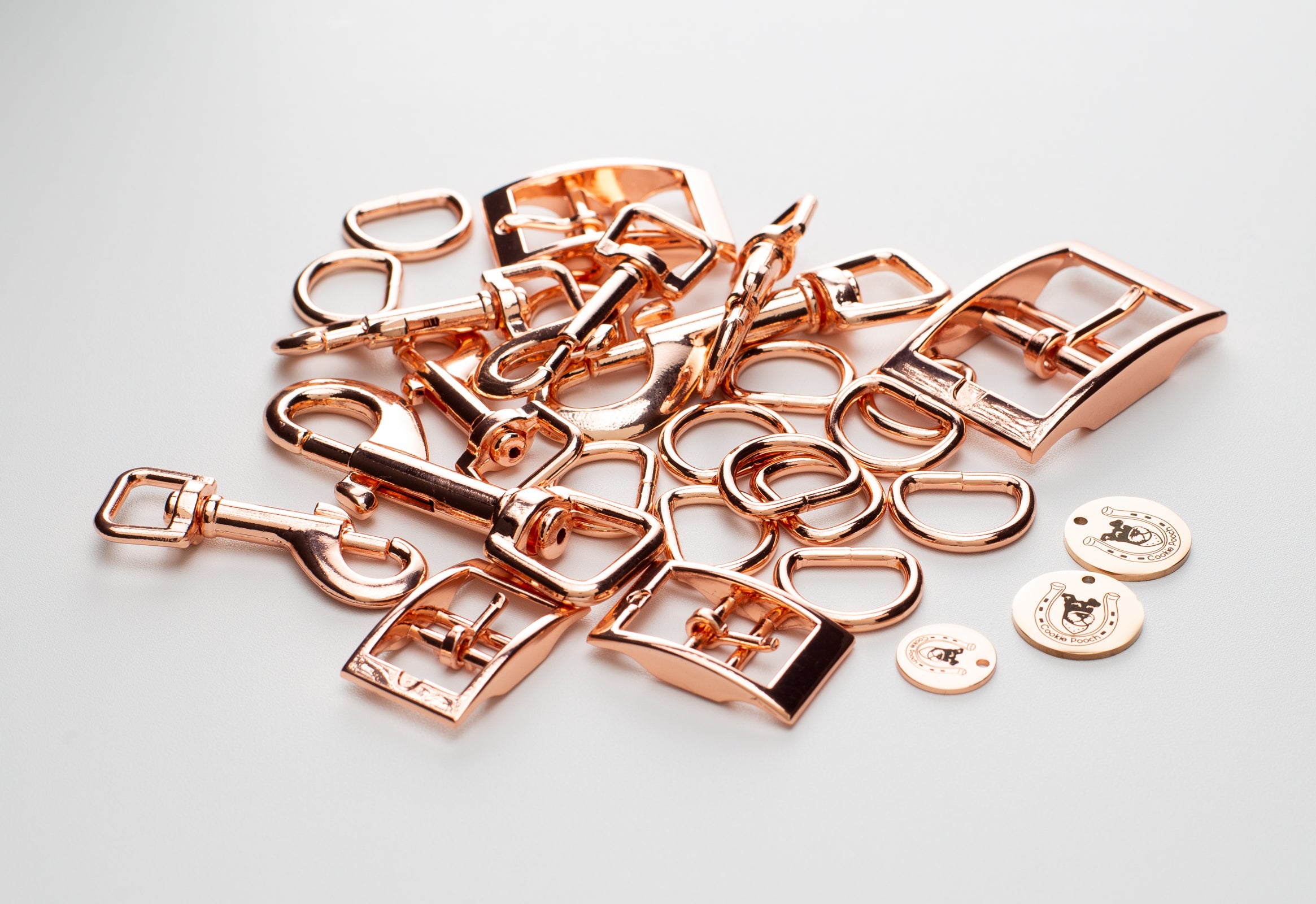 Cookie Poochの Dog Gear に使用している金具は、ローズゴールドを使用。 金具部分のお色で首輪やリードの印象も大変身!
