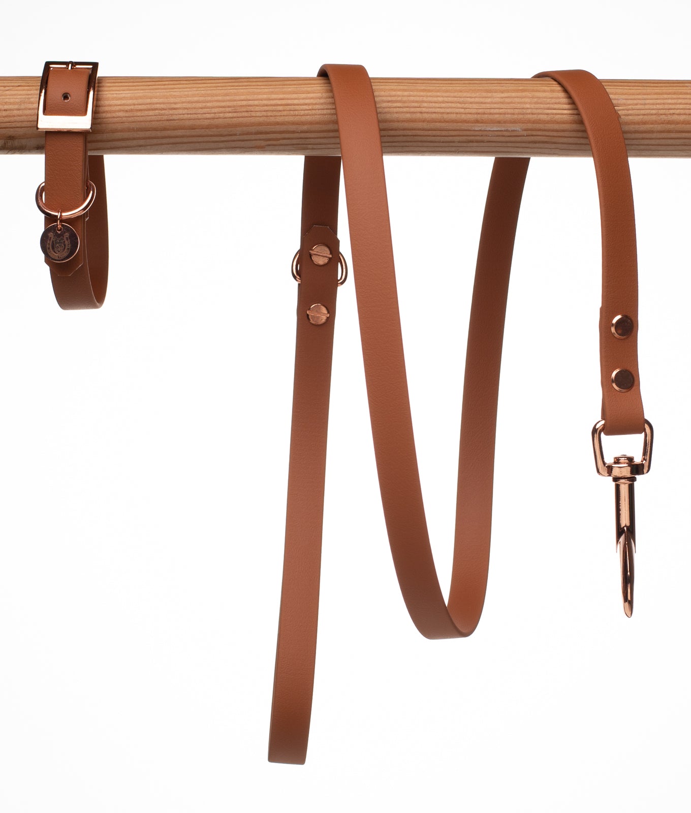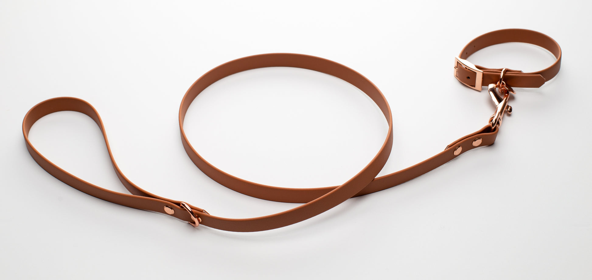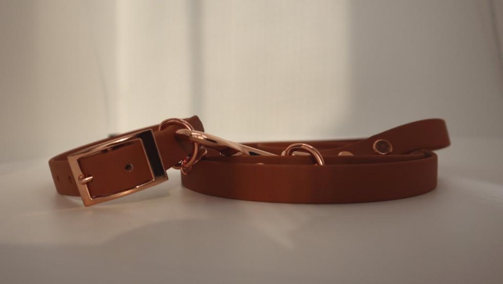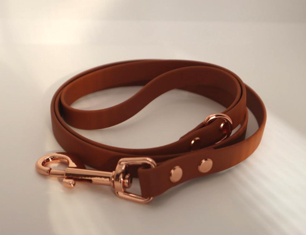 Brown BioThane dog lead. BioThane is extremely durable, waterproof, stinkproof and therefore headache proof for dog owners. This lead is great for adventurous pups that like to get muddy or go swimming.