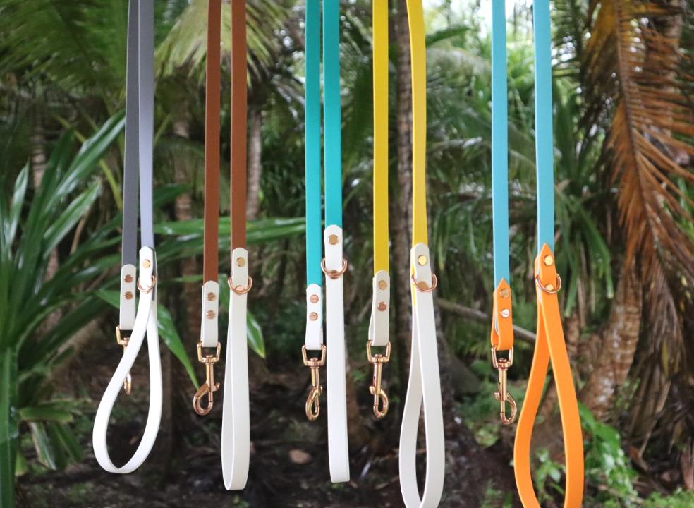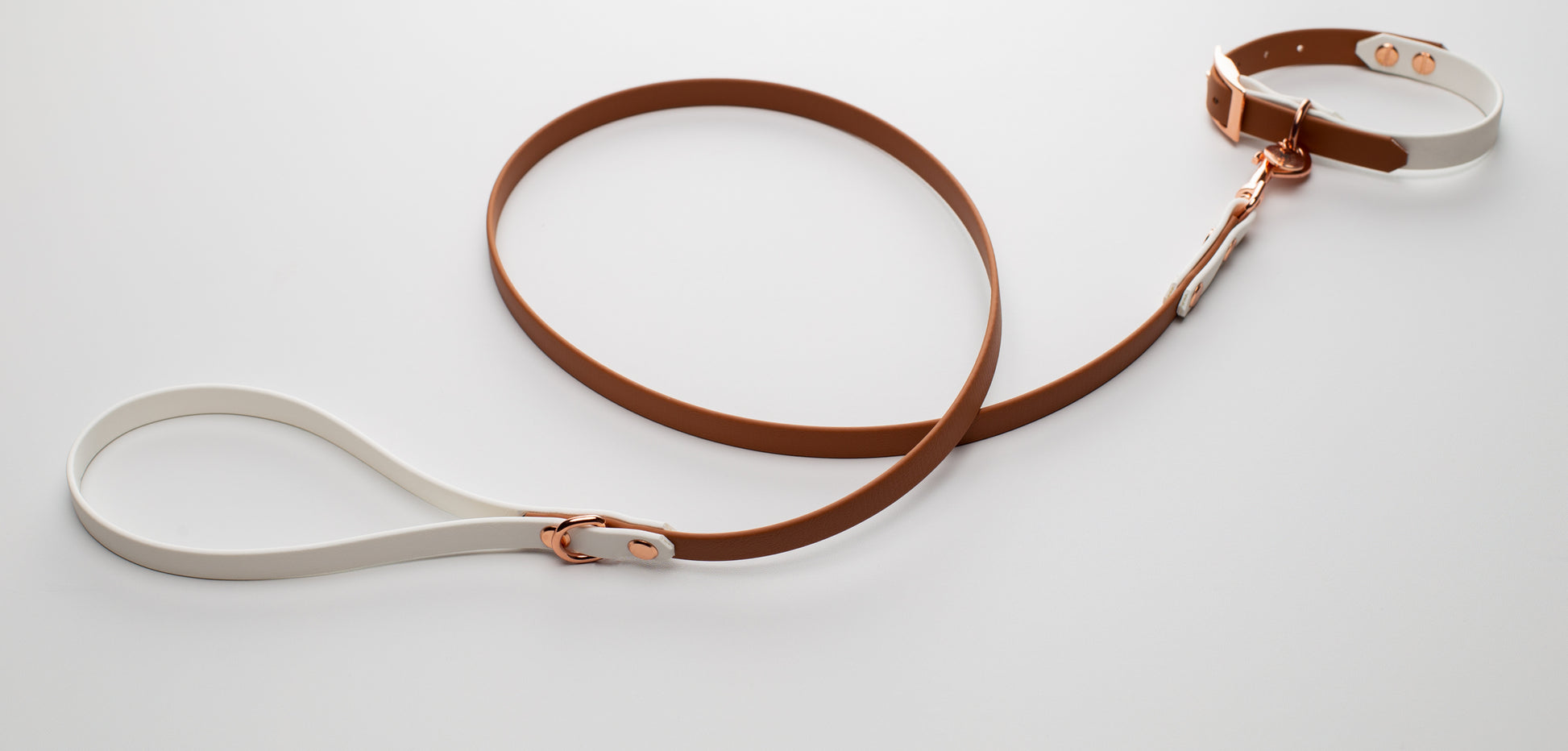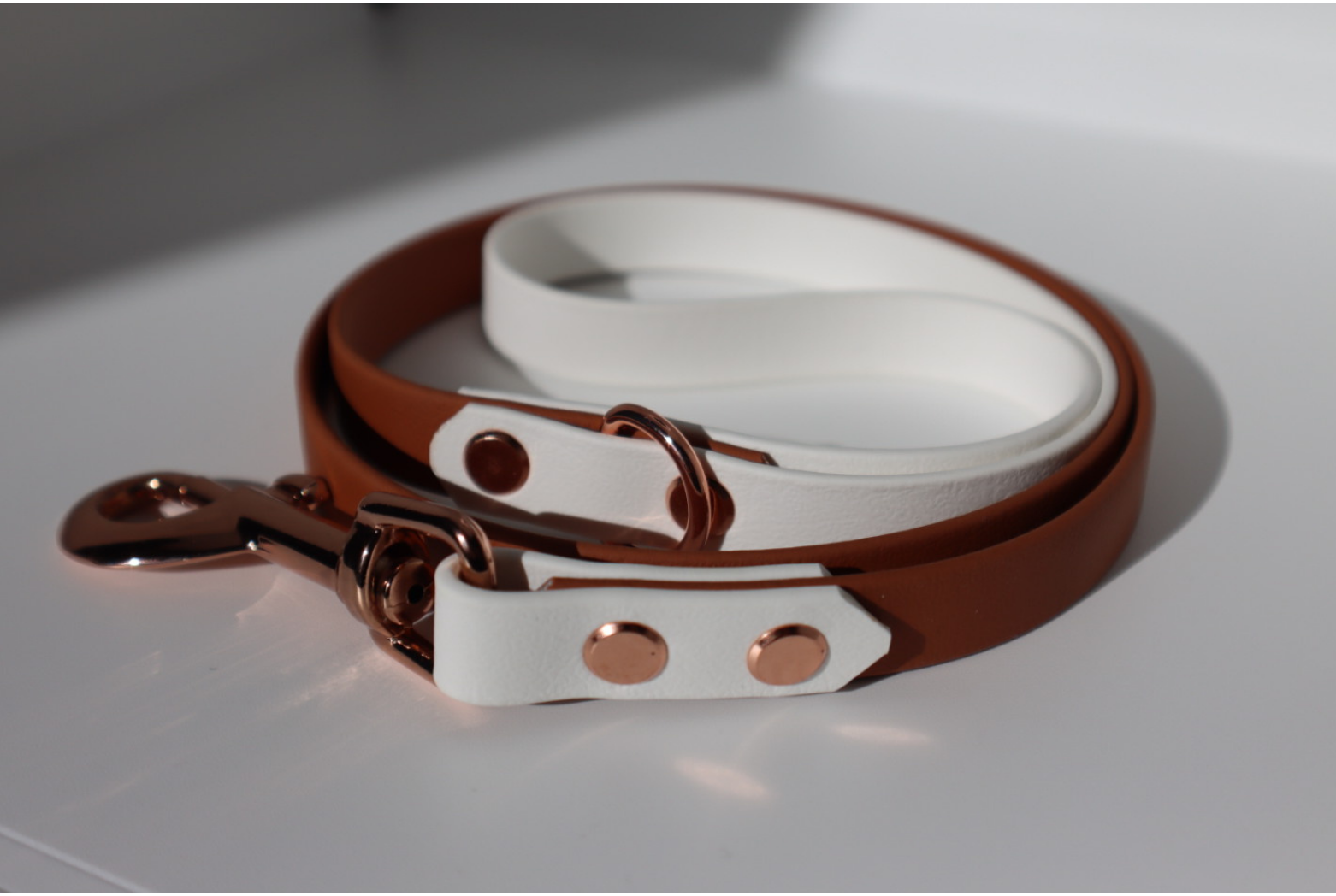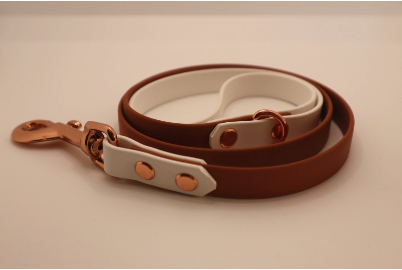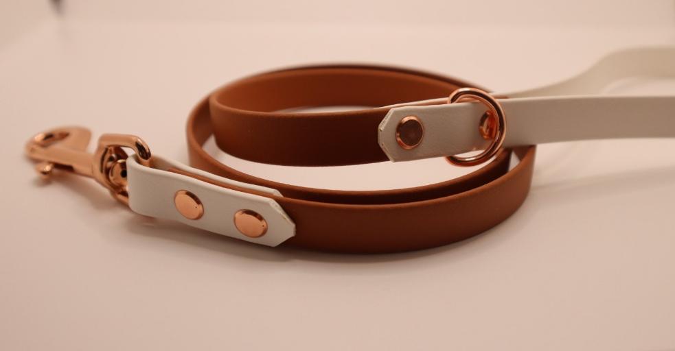 Brown×White BioThane dog lead. BioThane is extremely durable, waterproof, stinkproof and therefore headache proof for dog owners. This lead is great for adventurous pups that like to get muddy or go swimming.