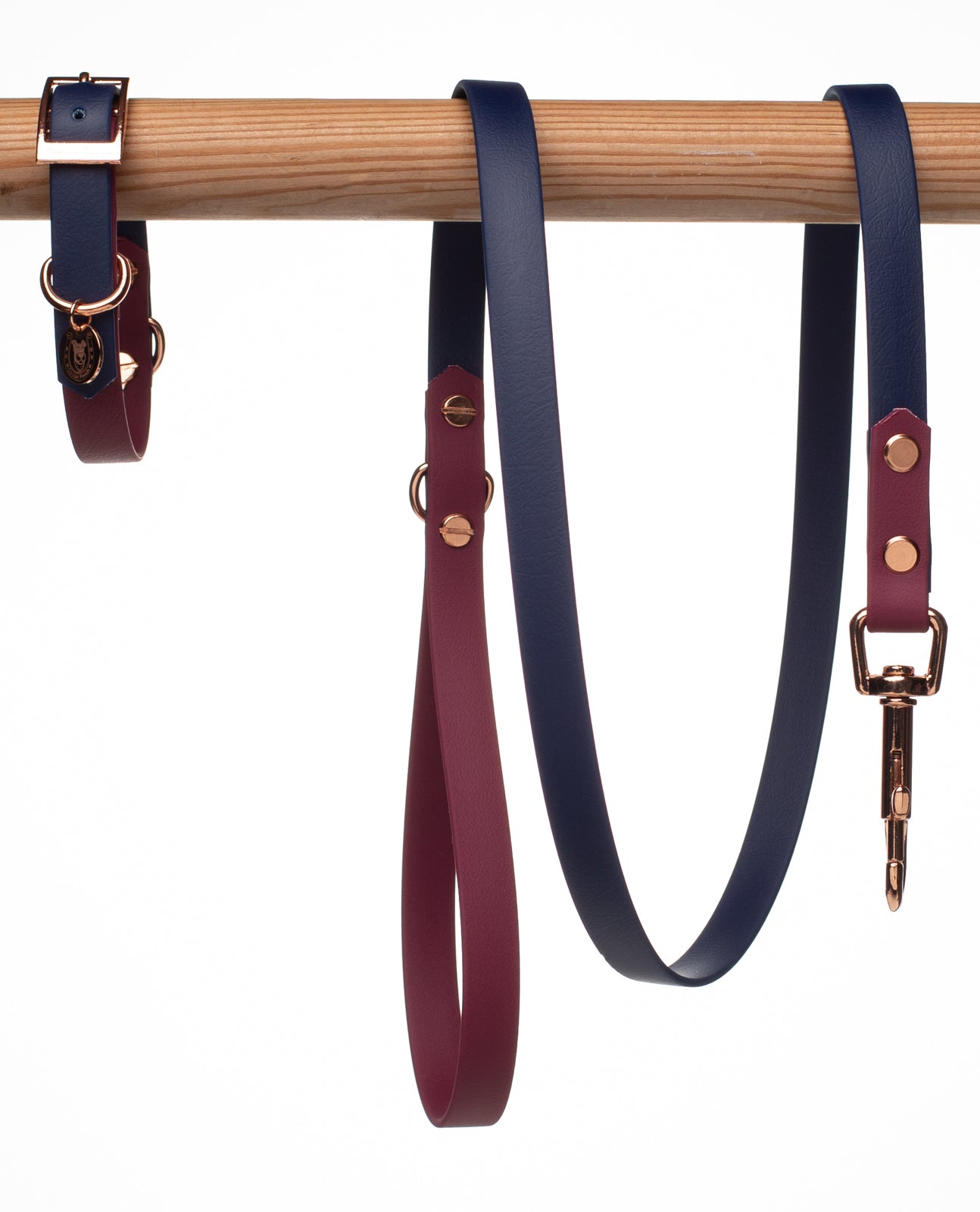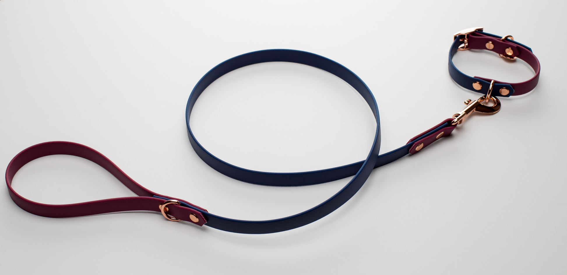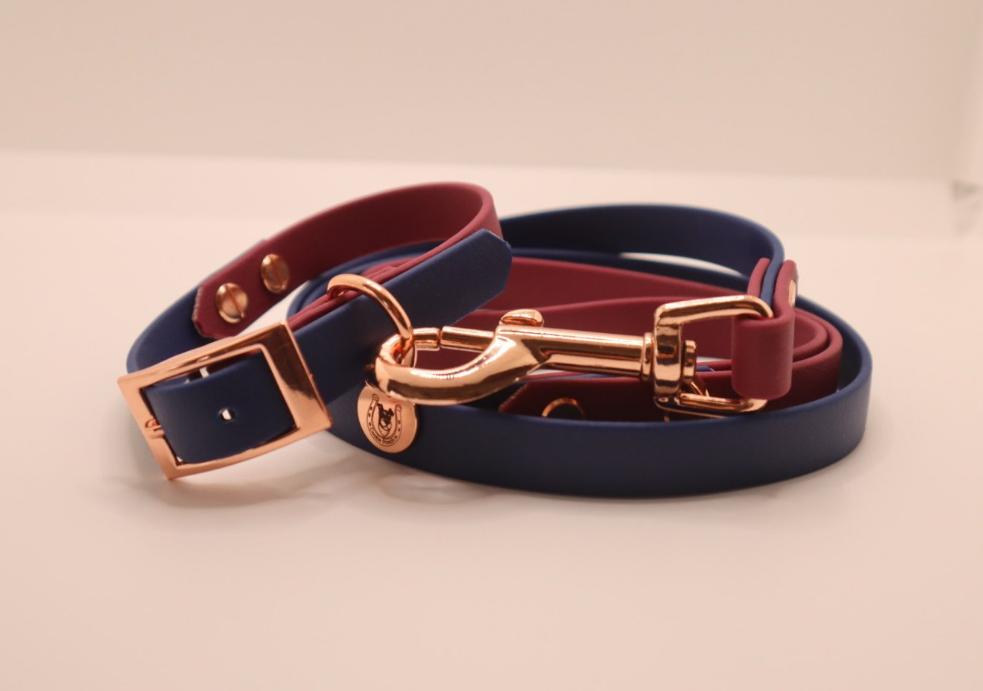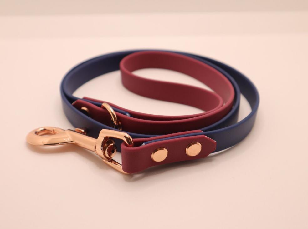 Navy ×Wine Red BioThane dog lead. BioThane is extremely durable, waterproof, stinkproof and therefore headache proof for dog owners. This lead is great for adventurous pups that like to get muddy or go swimming.Vegan and cruelty free