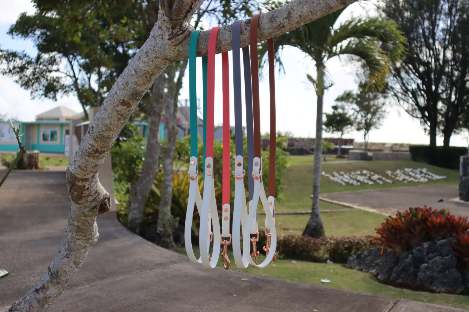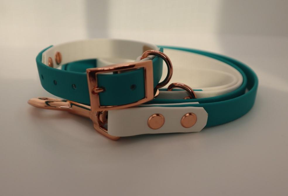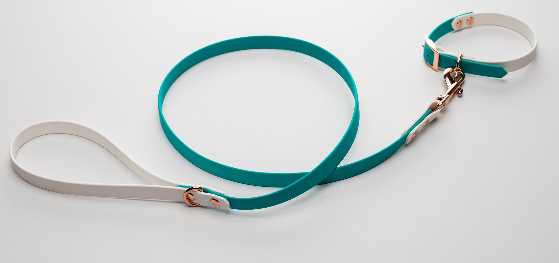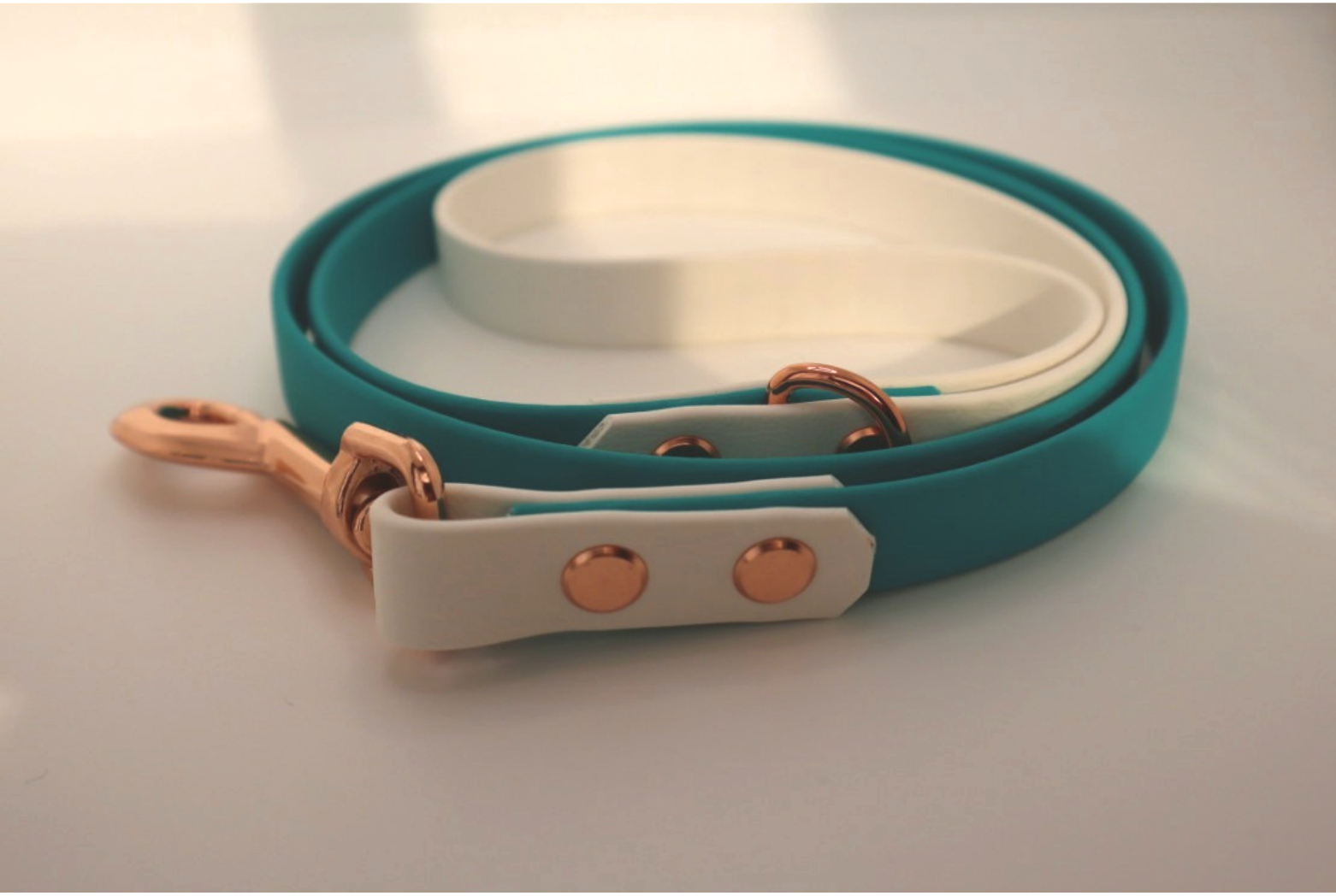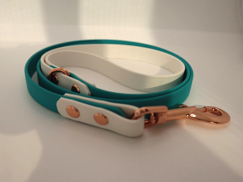 Teal×White BioThane dog lead. BioThane is extremely durable, waterproof, stinkproof and therefore headache proof for dog owners. This lead is great for adventurous pups that like to get muddy or go swimming.
