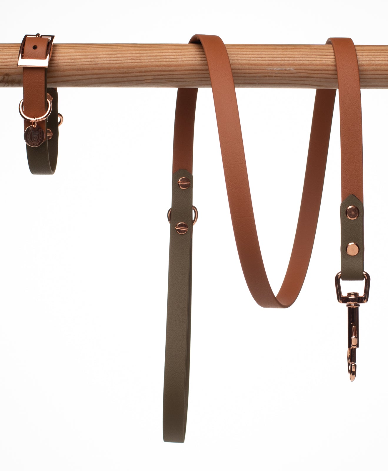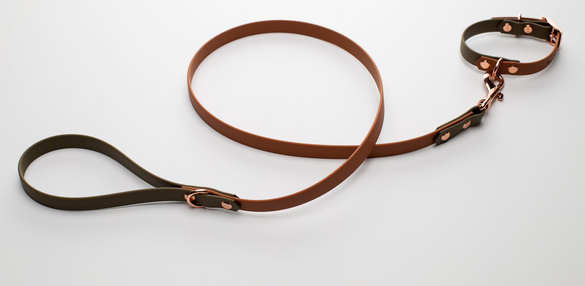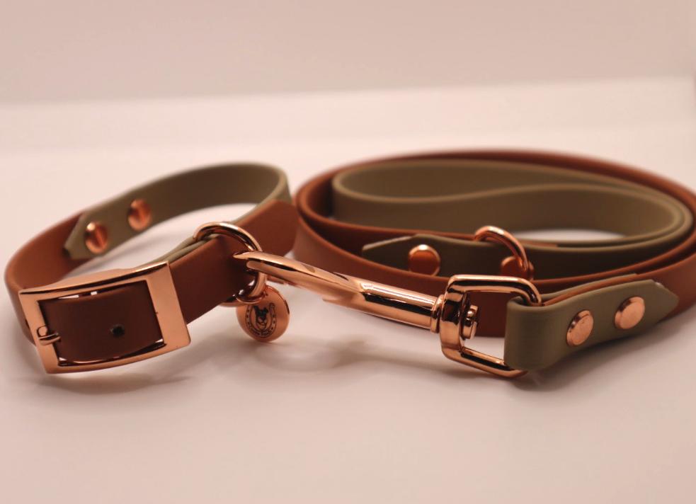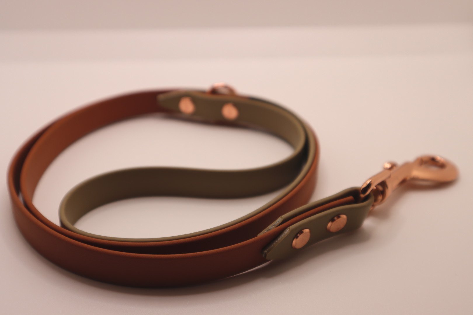 Brown×Olive BioThane dog lead. BioThane is extremely durable, waterproof, stinkproof and therefore headache proof for dog owners. This lead is great for adventurous pups that like to get muddy or go swimming.